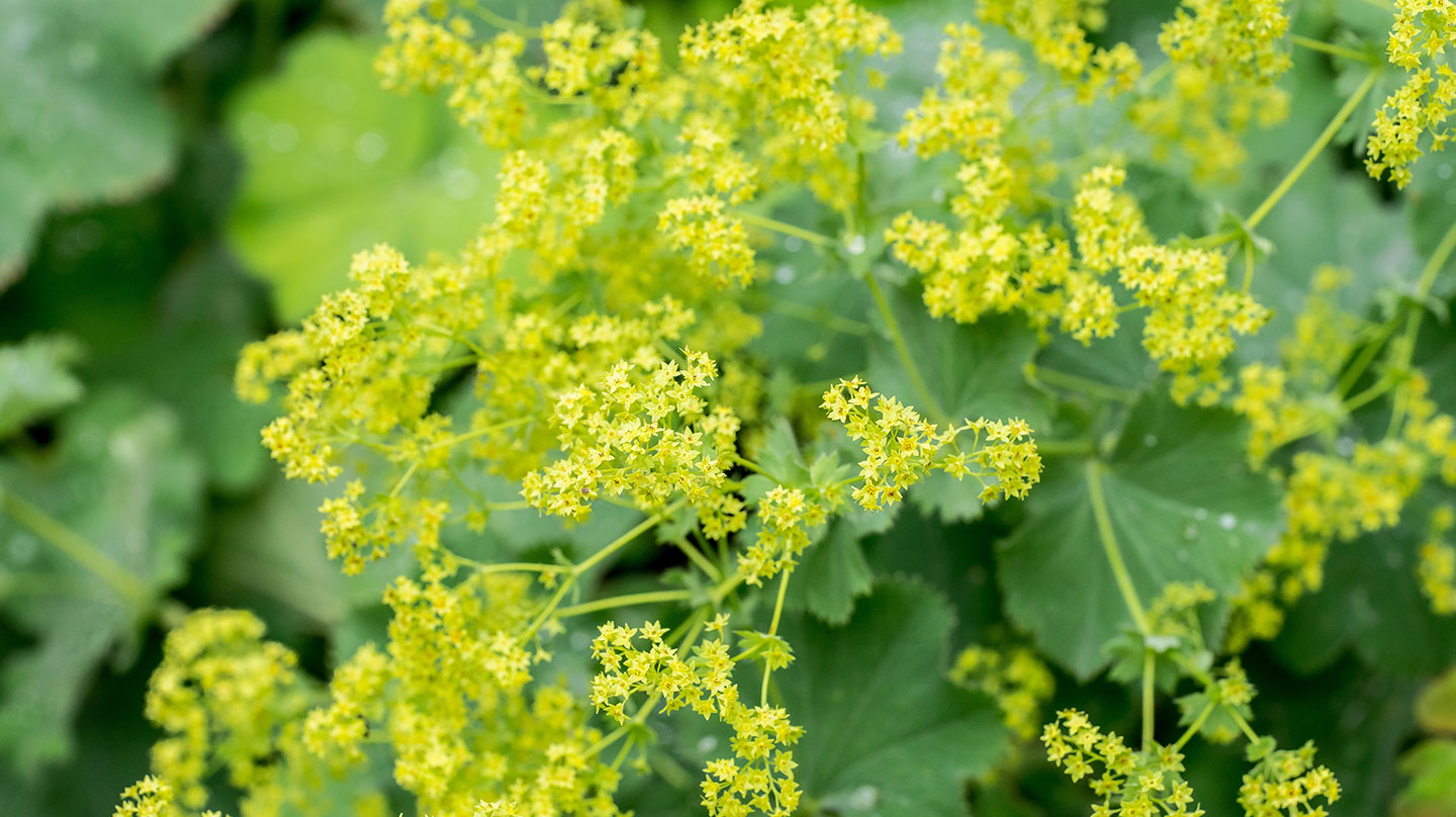 Beautiful alchemilla vulgaris blooming in the garden. Common lady's mantle flowers. |